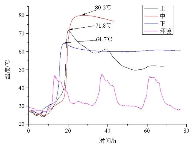 大體積混凝土施工也是普通水泥混凝土施工的難點問題,對于快硬、早強的鐵鋁酸鹽水泥混凝土來說更是難題。示范項目在首次大體積混凝土澆筑過程中,在筏板的上、中、下設置了三個測溫點,測溫曲線見下圖。1.3m厚大體積鐵鋁酸鹽水泥混凝土近似絕熱溫升狀態,其中心最高溫度80.2℃,溫升51.5℃。該溫升值與實驗室測試得到的絕熱溫升52.7℃極為接近。最高溫度在預計的控制范圍之內。模板拆除后,混凝土表面十分光潔,無任何裂縫,成功地解決了鐵鋁酸鹽水泥在南方高溫氣候下的大體積混凝土施工難題。