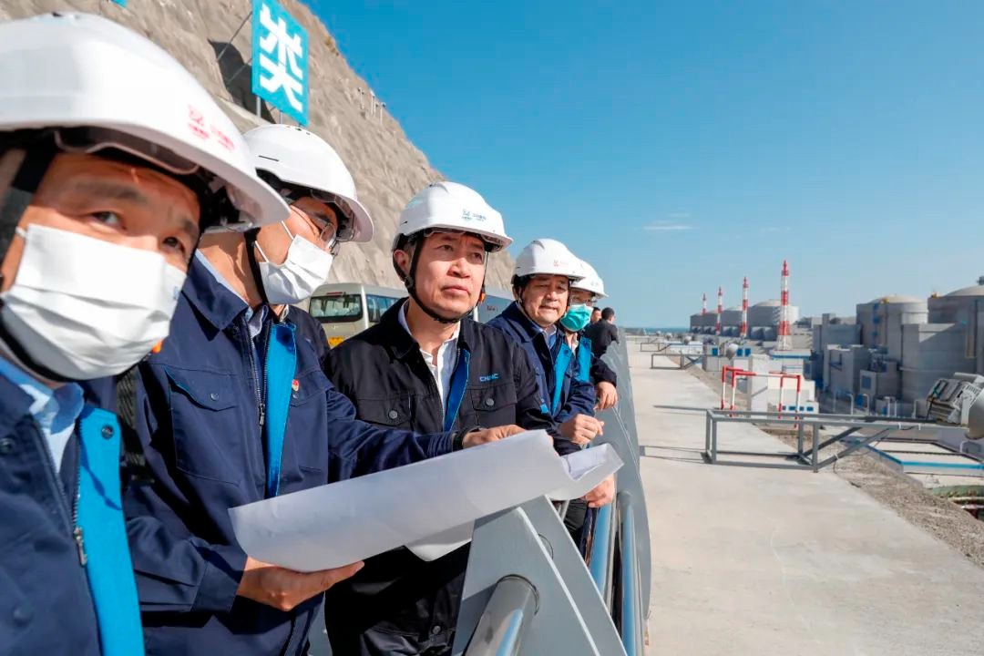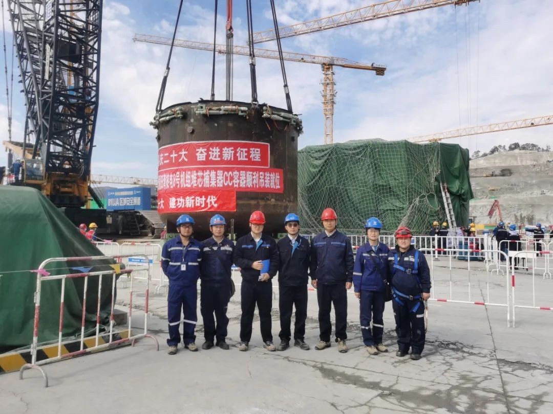 2022年10月20日,在中核集團總經理、黨組副書記顧軍,江蘇核電黨委書記、董事長劉兆華,總經理、黨委副書記張毅,中核工程田灣項目部黨委書記、總經理田利民,中核咨詢、中核華興等參建單位領導的共同見證下,田灣核電站8號機組堆芯捕集器容器平穩落位至堆芯豎井埋件上,田灣核電站8號機組第一臺堆芯主設備吊裝順利完成,至此,8號核島主設備安裝工作正式開始。