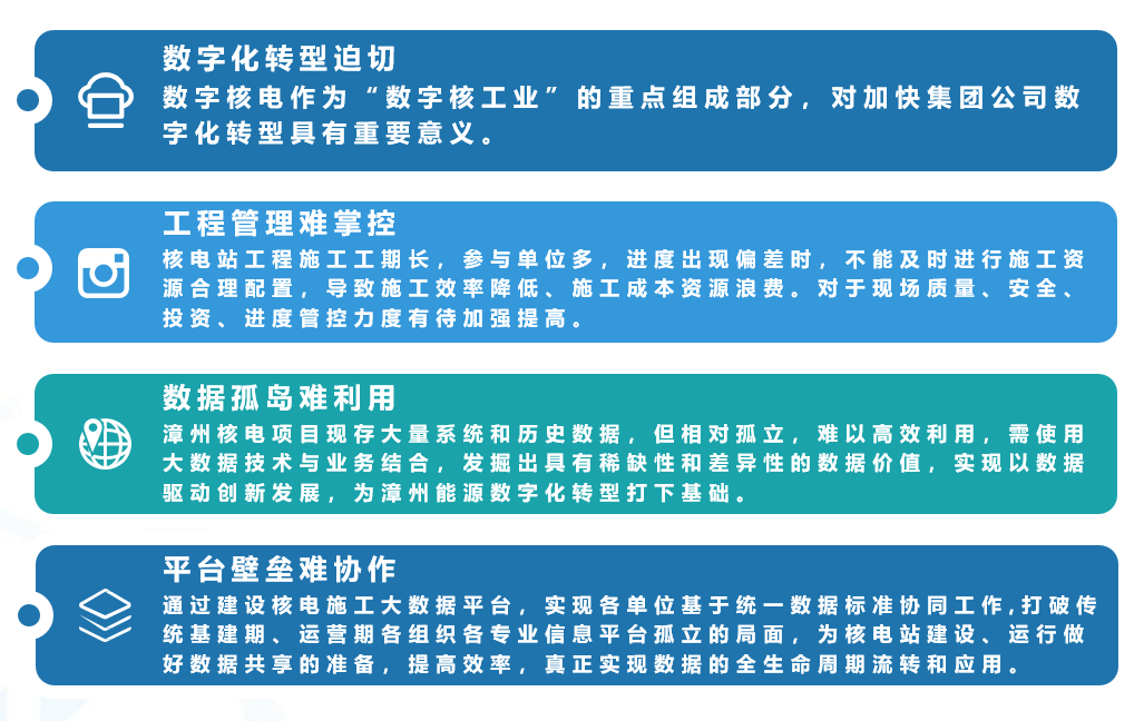 近年來,我國自主三代核電華龍一號批量化建設進展順利,各項工作正有序推進。漳州能源搶抓機遇,積極謀劃,以大數據賦能工程高質量建設,以信息化培育新動能,用新動能推動新發展,以新發展創造新輝煌。核電施工大數據平臺分析與應用項目被列入2020年工信部大數據試點示范項目。