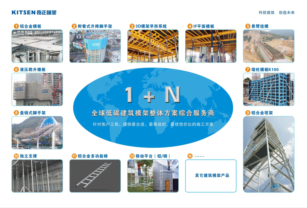 奇正公司產(chǎn)品有:建筑鋁合金模板、地下室三維早拆模板、智能附著式升降腳手架、智能爬升模板、高荷載早拆支撐體系、安全圍護(hù)、移動(dòng)工作平臺(tái)及各類型腳手架等。