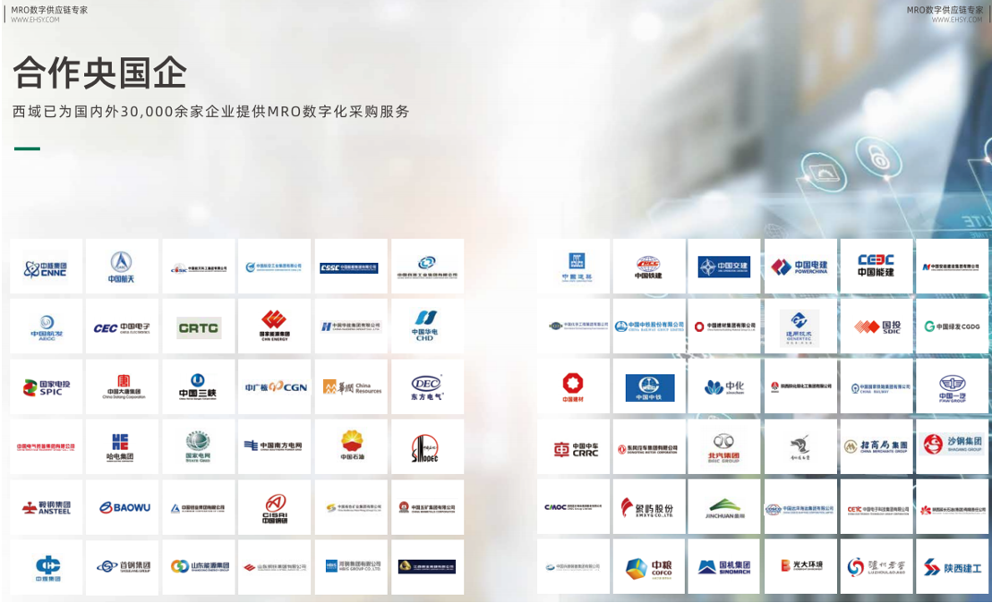 西域由IDG資本、ADV資本、奇誠(chéng)投資等頂級(jí)投資機(jī)構(gòu)注資,已為80%制造型央國(guó)企以及60%全球500強(qiáng)企業(yè)在內(nèi)的30,000余家國(guó)內(nèi)外企業(yè)提供專業(yè)化、高標(biāo)準(zhǔn)的MRO數(shù)字化采購(gòu)服務(wù),其中包括中國(guó)五大發(fā)電央企集團(tuán)、十大軍工央企集團(tuán)、八大建筑央企集團(tuán)等國(guó)有企業(yè),西門子、ABB、贏創(chuàng)、帝斯曼、蘋果等外資企業(yè)以及大疆、飛鶴等民營(yíng)企業(yè)。