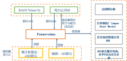 項(xiàng)目公司Fennovoima的股權(quán)結(jié)構(gòu)中,電力公司SF占股66%,ROSATOM股權(quán)由分公司RAOS Voima Oy持有,占股34%。Hanhikivi核電項(xiàng)目的建設(shè)成本預(yù)計(jì)為60億~70億歐元,股權(quán)投資占25%,債務(wù)融資占75%,債務(wù)融資由ROSATOM負(fù)責(zé)安排,項(xiàng)目投融資結(jié)構(gòu)如圖所示,符合芬蘭政府提出芬蘭企業(yè)(或在歐盟注冊(cè)企業(yè)或歐洲自由貿(mào)易協(xié)會(huì)成員)股比和不低于60%的要求。