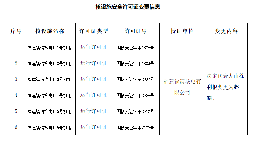 根據《中華人民共和國核安全法》《核動力廠、研究堆、核燃料循環設施安全許可程序規定》的有關要求,我局對你公司提交的關于福建福清核電廠1-6號機組運行許可證法定代表人信息變更的申請進行了審查,認為相關信息的變更符合核設施安全許可證變更的程序要求,現予確認。