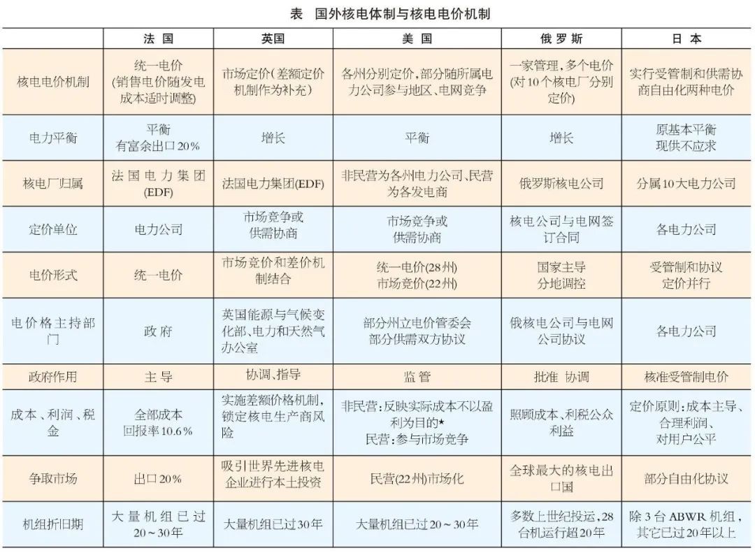 電力產品價格是效率經營狀態下合理成本與適當利潤的加總,是保障電力資源收益的重要組成部分。核電價格確定從系統性、全局性、歷史性多維度綜合考慮,屬于“一攬子”工程。核電機組負荷因子處于較高水平。核電投資比重大,燃料成本低,從社會整體看,核電調峰的機會成本高,因此各國監管機構都最大化利用核能機組,保持核電負荷因子處于高水準,世界核學會統計數據顯示近年來全球核電負荷因子都保持在80%以上。各國為核電提供有利的金融、財政稅收政策。核電機組的投資總額大,建設投產周期長,占用資金壓力巨大。為緩解核電企業的融資壓力,各國常采用提供低息貸款,對核電項目貸款進行貼息。特別是在核電企業投產商運初期,提供稅收減免等各種政策,保障企業現金流,增強核電企業的經濟性。如法國政府召集各大電力公司和電力密集型企業共同商討成立Exeltium公司,與法國電力公司達成協議,由Exeltium公司籌資為法電新建電廠提供資金支持,有效控制法國電力公司融資費用,也有效應對核電電價長期不確定性問題。長期以來,俄羅斯原子能公司在運作上以及財政方面獲得了政府的大力扶助。存在其他多種支持方式。例如在20世紀70年代,為了保障核電站企業運行穩定收益,法國政府同時審批20臺90MW的壓水堆核電站,允許法國電力公司保持每年開工建設6臺機組。雖然沒有直接的低息貸款或信用擔保,但是穩定的審批政策如同給核電市場注入“強心劑”。