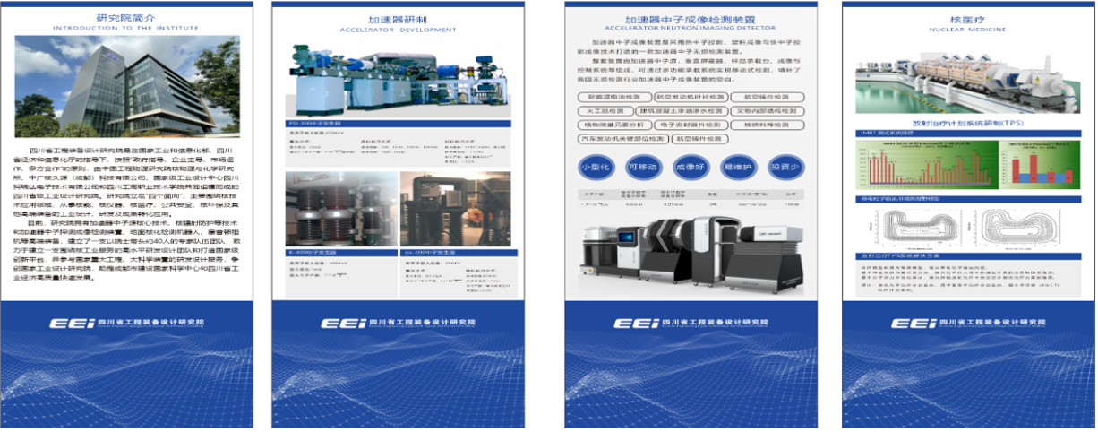 研究院業務范圍涵蓋多領域:工業設計、結構設計、裝備研發、系統集成、軟件開發、首臺套試制及專用設備開發。在成立短短2年時間內就已擁有加速器中子成像檢測裝置、氣態流出物低水平85Kr測量裝置、康普頓相機、表面污染監測儀、體內放射性檢測儀、γ放免計數器、輻射防護服等多款行業內高端產品,其中加速器中子探測成像檢測裝置是基于小型加速器中子源的可移動式中子成像檢測裝置,具有穿透能力強、不帶電等特點,在對重金屬組件、含氫材料、放射性材料的結構和缺陷及原子序數相近的材料進行無損檢測方面有獨特優勢,可廣泛用于航空航天、國防軍工、核工業、裝備制造、鋰電行業等領域的無損檢測。氣態流出物低水平85Kr測量裝置采用基于β射線測量的內充氣塑料閃爍體方案,與當前核電站普遍采用的高純鍺譜儀直接測量方式相比,該方法測量的目標β射線要比γ射線分支比高三個量級,探測下限也相應高三個量級。并且塑料閃爍體具有機械加工性能好的優點,可根據85Krβ射線射程設計合適厚度的探測器,能有效降低干擾γ射線在探測器中的能量沉積,降低本底水平。