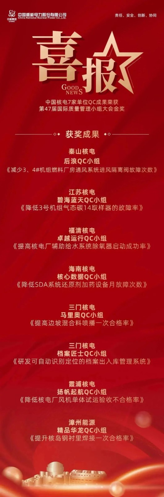 繼6個QC小組榮獲第46屆國際質(zhì)量管理小組大會金獎后,中國核電再一次在國際舞臺展示了QC小組活動風采。其中,海南核電已經(jīng)連續(xù)六年榮獲此項殊榮;秦山核電和江蘇核電已經(jīng)是第四次榮獲此項殊榮;三門核電和福清核電已經(jīng)連續(xù)三年榮獲此項殊榮;霞浦核電再度榮獲金獎,漳州能源首次參賽獲得金獎。