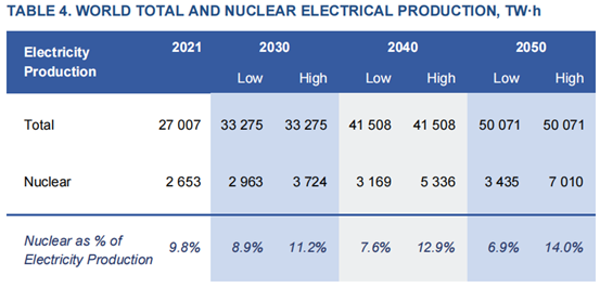 低值情景中,盡管核發電量到2030年、2040年和2050年將分別增至2.96萬億千瓦時、3.17萬億千瓦時和3.44萬億千瓦時,但核發電量份額將分別降至8.9%、7.6%和6.9%。