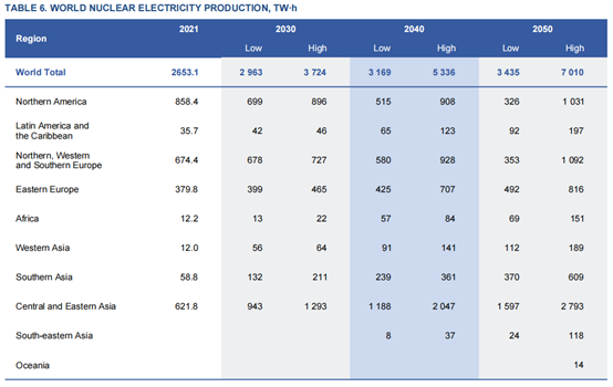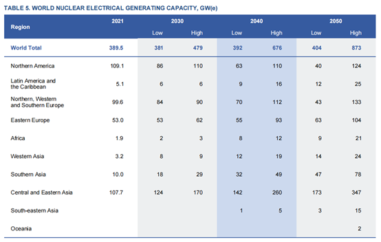 2022年9月26日,國際原子能機構(IAEA)發布2022年版年度報告《直至2050年能源、電力和核電預測》。這是該系列的第42版預測報告,概述了截至2021年底國際原子能機構各成員國的核電發展狀況,并根據國際能源署(IEA)《2021年世界能源展望》和美國能源信息管理局(EIA)《2021年國際能源展望》等研究報告,對全球以及各地區直至2050年的能源、電力和核電發展情況進行了預測。