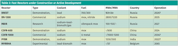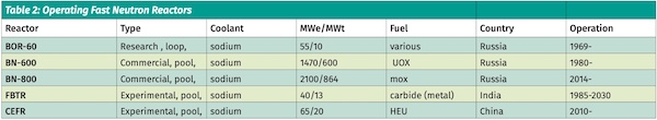雖然到20世紀90年代,歐洲和美國的FNR發展實際上已經停止,但俄羅斯、中國和印度的FNR仍在快速發展,目前有五個FNR正在運營(見表2),另有五個FNR正在開發中(見表3)。