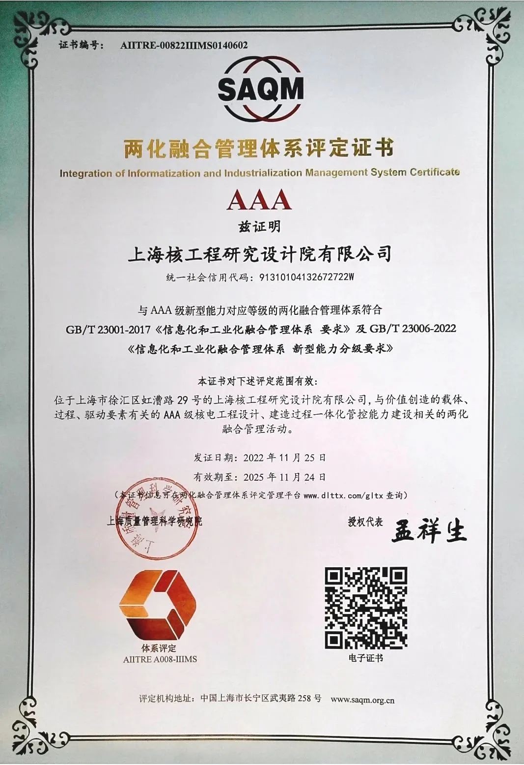近日,上海核工院順利通過國家工信部兩化融合管理體系專家組審查復核及公示,獲得兩化融合2.0版體系貫標的AAA級認證。
