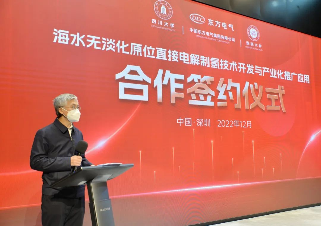 2022年12月16日,東方電氣股份有限公司、東方電氣(福建)創新研究院有限公司與四川大學/深圳大學謝和平院士團隊在深圳簽署“海水無淡化原位直接電解制氫原創技術中試和產業化推廣應用”的四方合作協議。中國工程院院士謝和平,東方電氣集團黨組成員、副總經理張彥軍,深圳大學副校長汪永成等出席簽約儀式。