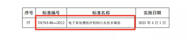 近日,中國核學(xué)會發(fā)布公告,批準(zhǔn)發(fā)布57項(xiàng)團(tuán)體標(biāo)準(zhǔn),其中包括由中廣核達(dá)勝加速器技術(shù)有限公司(簡稱“達(dá)勝公司”)主編的《電子束處理醫(yī)療機(jī)構(gòu)污水技術(shù)規(guī)范》(T/CNS 88-2022)。根據(jù)公告,該技術(shù)規(guī)范將于2023年4月1日起正式實(shí)施。