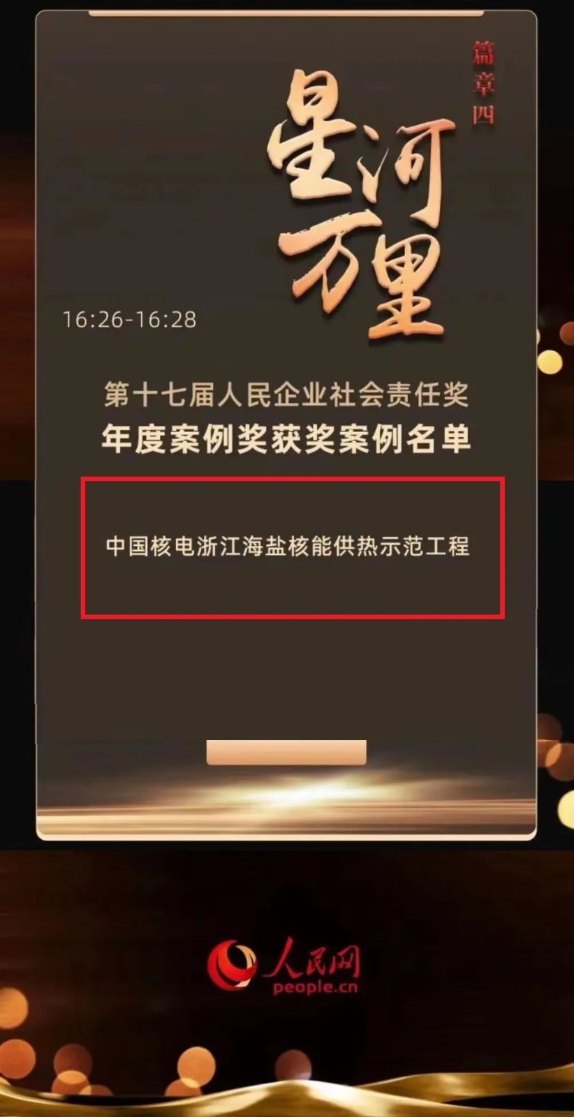 為見證2022年企業在社會責任領域取得的成績與收獲,12月24日,人民網在人民日報社指導下舉辦“奮進新征程 譜寫新篇章——2022人民企業社會責任高峰論壇”。論壇上,中國核電浙江海鹽核能供熱示范工程獲評“第十七屆人民企業社會責任獎”年度案例獎。