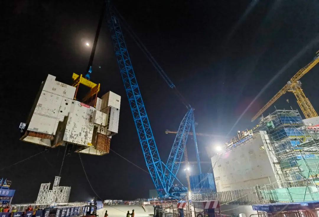 CA01模塊吊裝總重超過1000噸,是三門核電二期工程起吊重量最大的模塊,用于構(gòu)成換料水池、蒸汽發(fā)生器隔間、穩(wěn)壓器腔室等重要房間,也是核電站最核心的模塊之一。