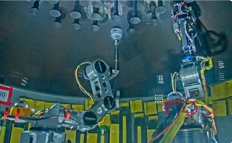 美國比弗谷核電站大修成功也是核工業科技創新的典范工程。在2022年度這次大修中,比弗谷核電團隊首次使用了西屋雙子座機器人檢查系統,用于封頭檢查。雙子座系統使用兩個獨立的關節機械臂,可以通過視覺、超聲波和渦流檢查。其設計用于通過機頭架上的人員進出口進行安裝和拆卸,從而減少了安裝或拆卸設備時拆卸機頭的需要。