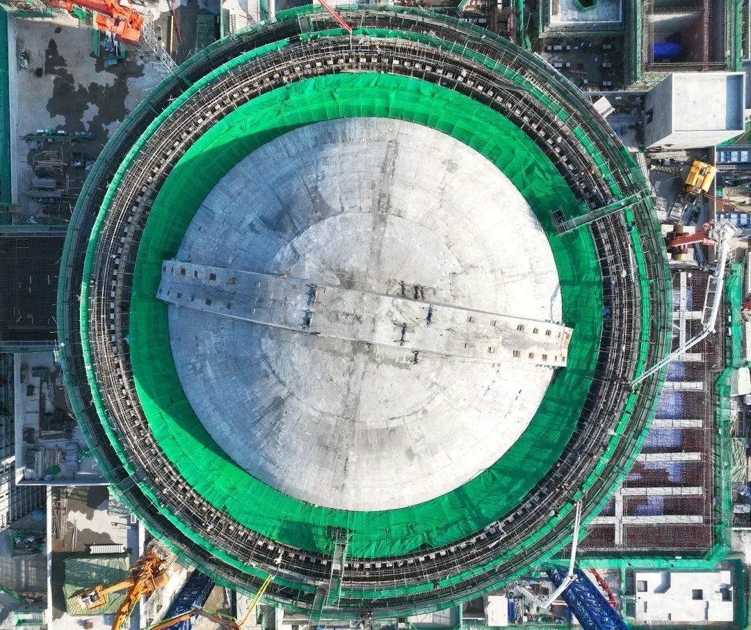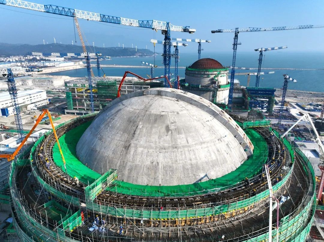 華龍一號漳州核電1號機組外層安全殼由筒體、準球形穹頂、外掛水箱三部分組成,在結構上與燃料廠房、電氣廠房連為一體,是核電機組的重要安全保障,其強度可抗大飛機沖撞和9級大地震。