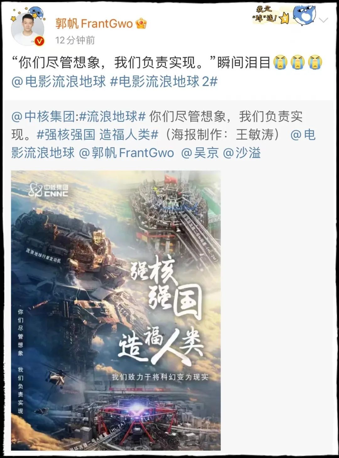 近日,中核集團發布一張海報,畫中赫然顯現電影《流浪地球2》中的行星發動機,并排的是中核集團的核聚變實驗裝置:中國環流器二號,文案寫著“你們盡管想象,我們負責實現。”海報被網友譽為“最硬核的夢幻聯動”,同時引發史無前例的“央企朋友圈評論”。中國航天科工微博留言“這事咱不得一起嗎”;中國船舶留言“你就說我干點啥吧”;中國聯通表示“我負責通信”;中國石化聲稱“我負責能源”……這恐怕是電影上映之初未設想到的溢出效應——一部電影能吸引如此多“行業客戶”。