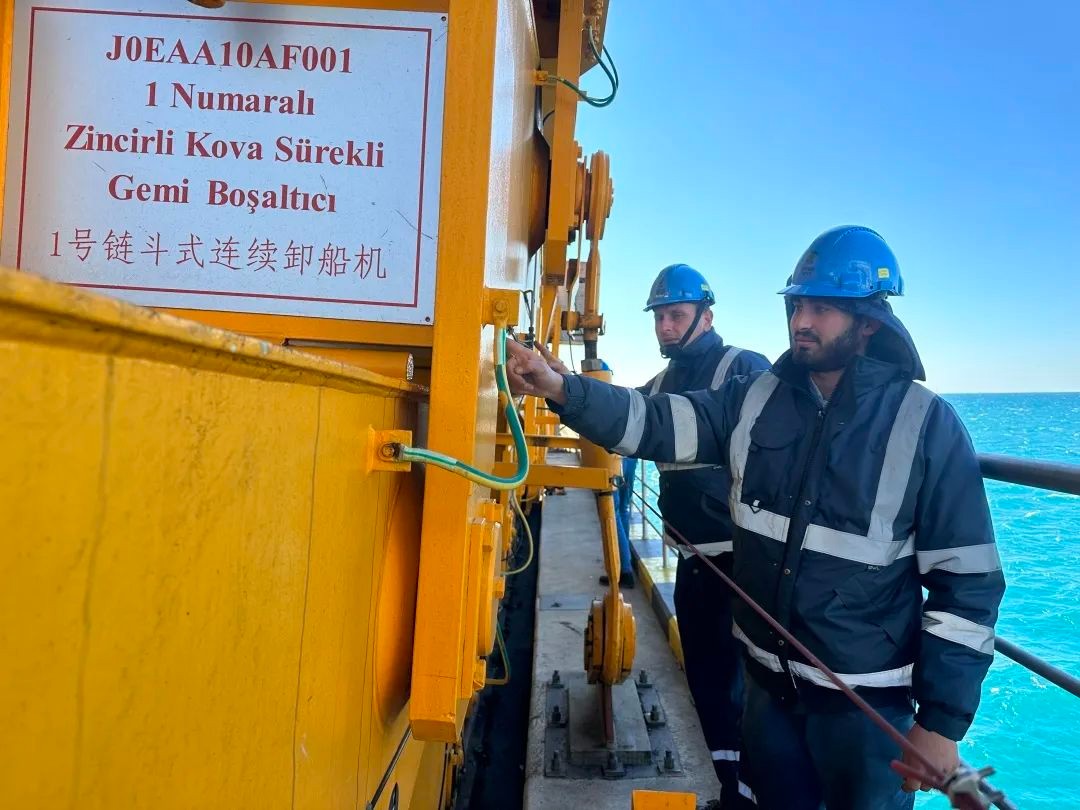 ▲上海電力土耳其胡努特魯電廠員工正檢查卸船機工作情況