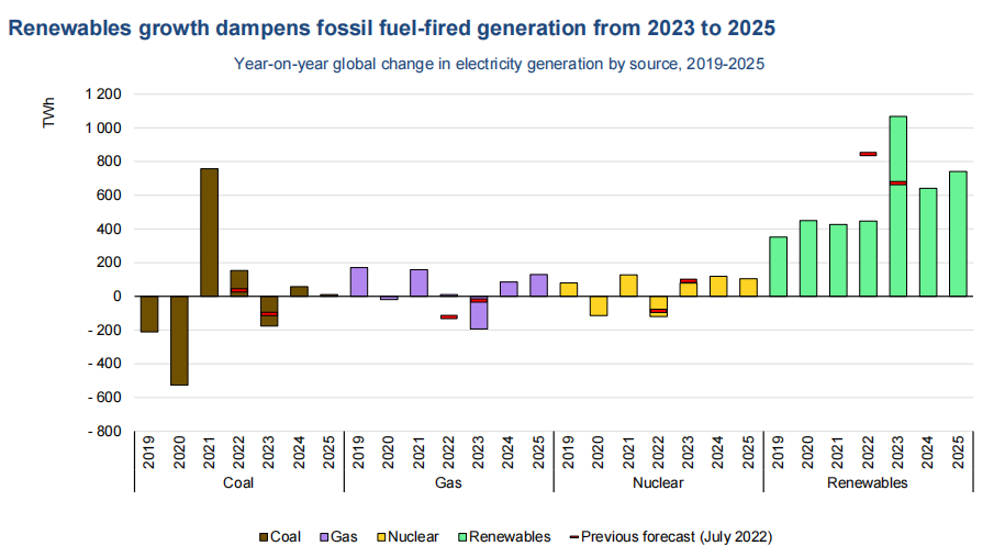 國際能源署對2023—2025年全球電力市場發展情況做出預測。可再生能源和核能將在滿足全球電力需求增長方面占主導地位,滿足90%以上的增量電力需求。全球天然氣發電量和燃煤發電量將大致保持平穩。可再生能源在全球電力結構中的占比將從2022年29%上升到2025年35%。因此,全球與發電相關的碳排放量在2023—2025年間將趨于平穩,并在未來逐步下降。