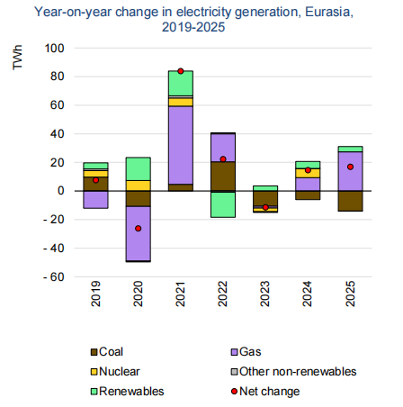 歐亞地區(即前蘇聯解體后各個加盟共和國所在的地區)2022年電力需求同比增長1.5%,與2021年高達6%的增長率相比明顯放緩。此外該地區70%的電力需求增量集中在上半年,下半年增長率一度低至1%以下。導致這一情況主要原因是,受俄烏沖突影響,俄羅斯以及與之在經濟和政治上保持密切聯系的國家經濟持續惡化。根據國際能源署預測,2023—2025年,該地區電力需求年均增長率將低于1%。