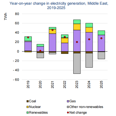 2022年,受人口增長、能源密集型企業規模擴大、對空調和海水淡化需求增加等因素的影響,中東地區電力需求同比增長超過2.6%。國際能源署預計,2023—2025年,中東電力需求的年均增速將略低于2022年。天然氣將依然是中東地區的主要電力來源,其發電量占比將從2022年72%增加到2025年77%,而燃油發電量預計將從2022年21%下降到2025年14%。2022年中東地區發電相關碳排放量略有增長,漲幅為0.7%,預計到2025年將下降2%。