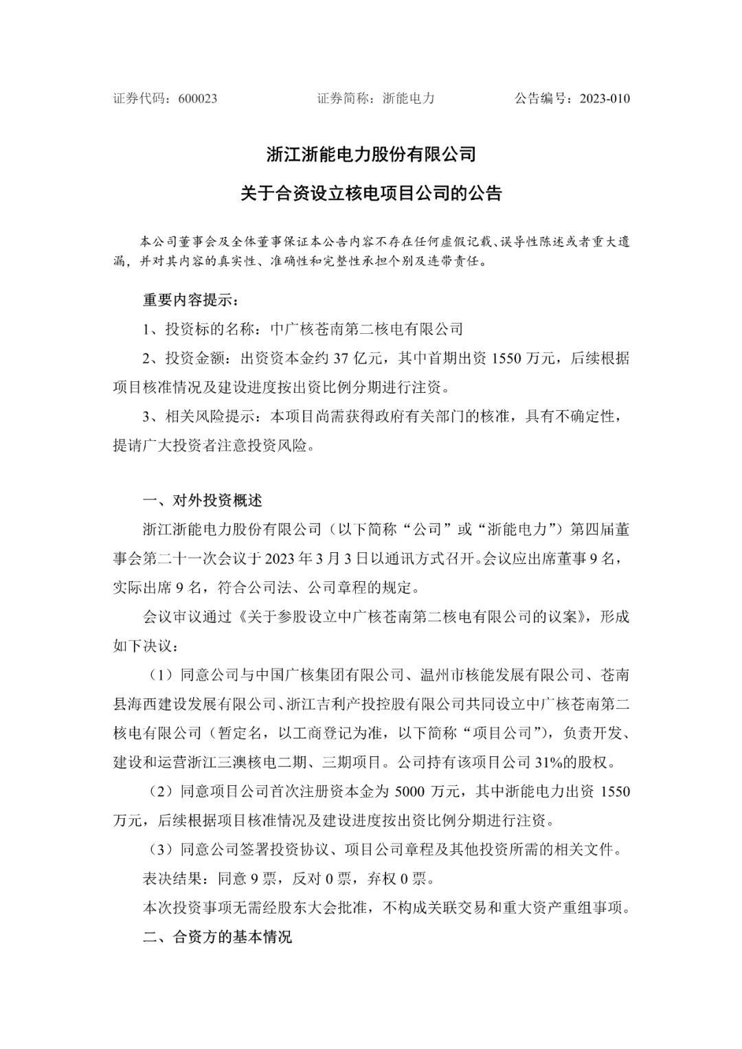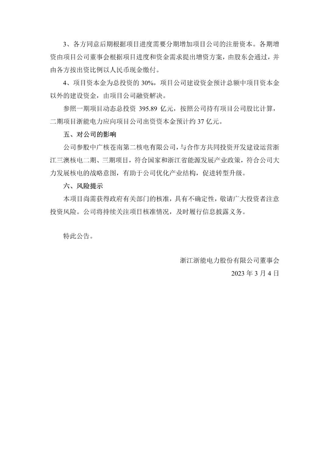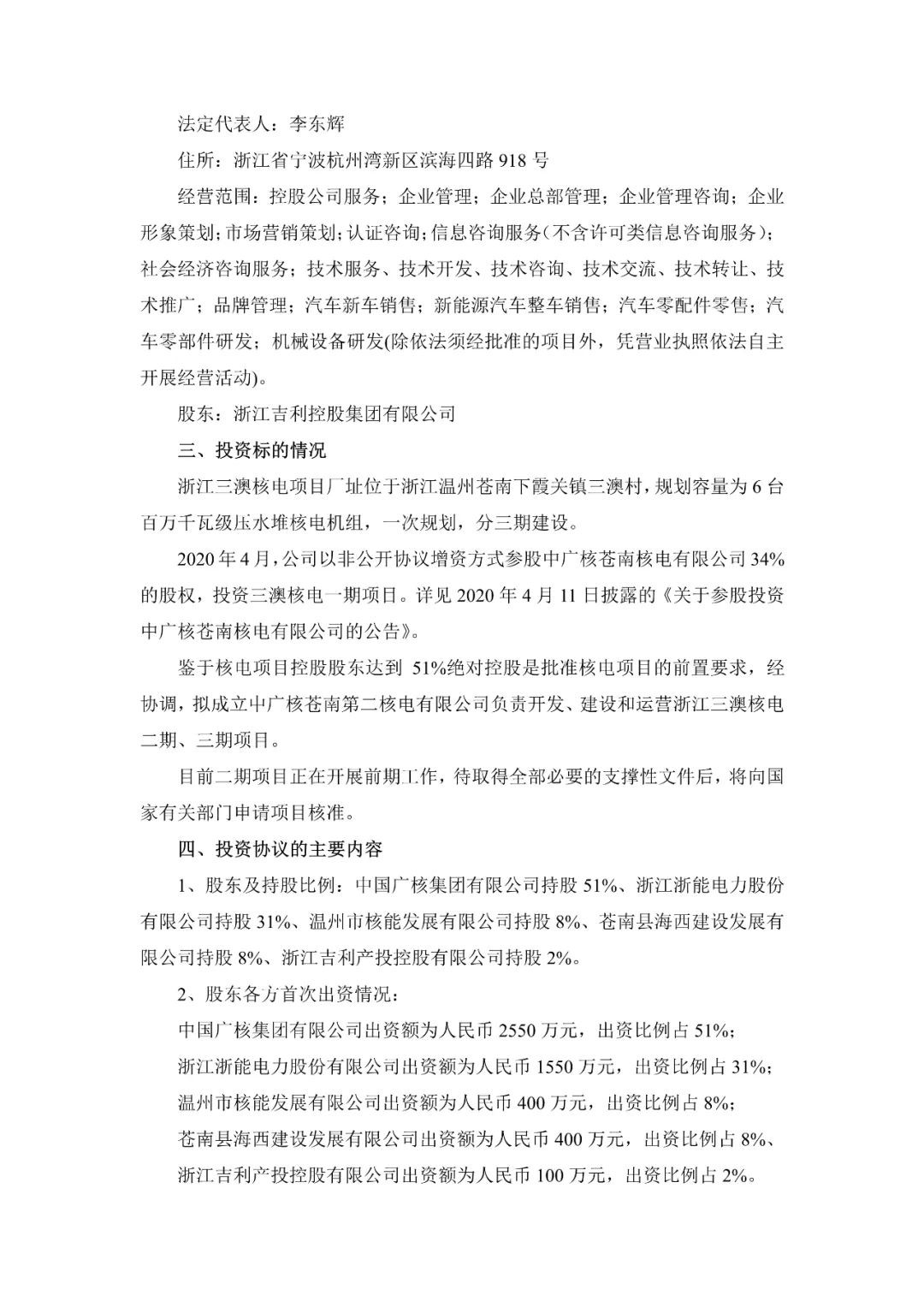 浙能電力3月4日發(fā)布公告稱,同意與中國廣核集團有限公司、溫州市核能發(fā)展有限公司、蒼南縣海西建設發(fā)展有限公司、浙江吉利產投控股有限公司共同設立中廣核蒼南第二核電有限公司(暫定名,以工商登記為準,以下簡稱“項目公司”),負責開發(fā)、建設和運營浙江三澳核電二期、三期項目。公司持有該項目公司31%的股權。