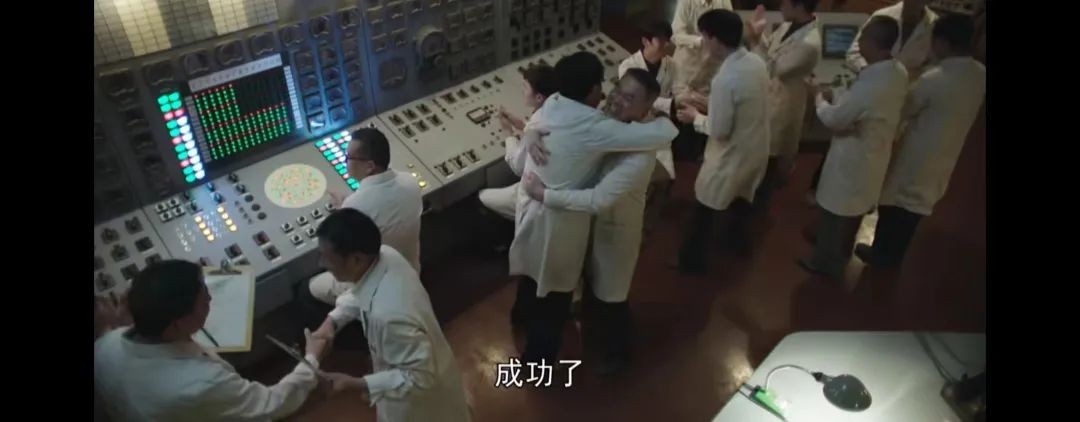 隨著劇中主角之一的岳長山向反應堆操縱員下達開始命令,反應堆啟動。當反應堆運行功率到達9.6%,指揮長命令核動力裝置兩臺發電機,并網帶負荷運行,此時反應堆功率迅速提升,核裂變產生的熱蒸汽推動汽輪機飛速旋轉,中國核能的第一度電由此發出。主控室內的人們歡欣鼓舞,熱烈相擁。當年的絕密工程,在跨越53個春秋后,終于通過電視熒幕和互聯網呈現在廣大觀眾的眼前。