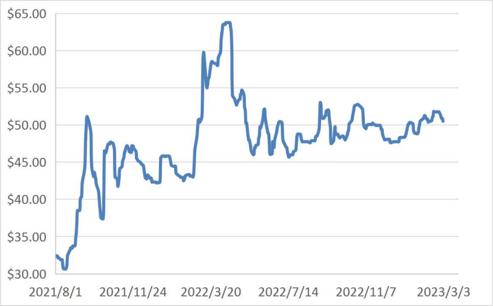 隨著周四傳出美聯(lián)儲官員表態(tài)支持在夏季中后期將有條件暫停加息的消息,三大美股指數(shù)周五收漲。道指一周上漲574點(diǎn)(+1.75%),標(biāo)普500指數(shù)一周上漲76點(diǎn)(+1.90%),納指一周上漲294點(diǎn)(+2.58%)。本周加拿大斯普羅特天然鈾實(shí)物信托基金(SPUT)股價折價交易延續(xù),繼續(xù)減弱其融資和采購天然鈾的能力。天然鈾現(xiàn)貨市場缺乏買手,現(xiàn)貨鈾價回調(diào)至2月中旬的低點(diǎn),周五以50.50美元/磅收盤。