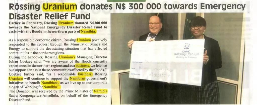 2023年1月下旬,納米比亞北部地區短時間內連降大雨,形成洪澇災害,大量房屋和校舍受到影響,給當地居民的生產生活造成巨大困難。礦長約翰在捐贈儀式上表示,我們看到了北部受災的照片和報道,作為一個負責任的企業,我們不能坐視不管,希望本次捐贈能夠幫助當地的受災群眾重建家園,正如羅辛的口號“為納米比亞工作”“Work for Namibia”,羅辛也將一如既往響應政府號召,為納米比亞作出更多貢獻。