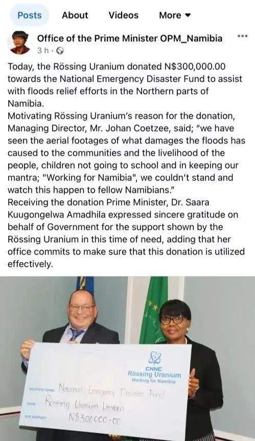 總理薩拉女士接受捐贈后,對中核集團羅辛鈾礦表達了真摯的感謝,并通過總理辦公室官方媒介鄭重承諾一定會用好這筆捐助。納米比亞國家電視臺進行了專題報道,納總理府社交媒體賬號也發布了相關新聞帖子。納米比亞人報、經濟學人、全非洲報、信息報、埃龍戈報以及納米比亞礦業協會官方網站等海外媒體對此次捐贈進行了聚焦報道。