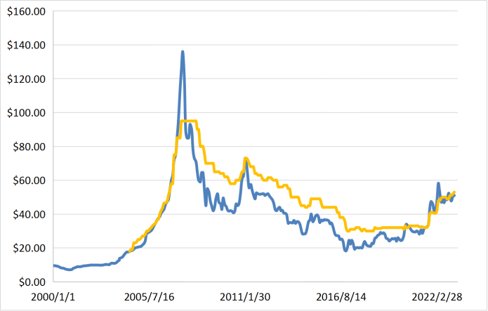 2020年1月—2023年2月末現貨鈾價和長貿鈾價