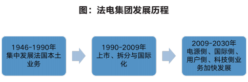 20世紀(jì)40年代,為了戰(zhàn)后重建,法國政府對(duì)電力行業(yè)實(shí)施國有化,組建了法電。1946年,法國將1450家私營的發(fā)、輸、配電公司及燃?xì)夤緡谢M建成法國電力公司。在法國電力工業(yè)發(fā)展初期,法電受政府要求集中力量開展水電、火電、核電、輸電建設(shè),迅速完成了資產(chǎn)、人才、技術(shù)、資源的原始積累。