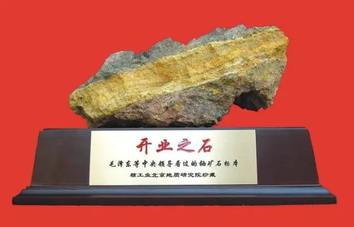 在核電科技館的一個展臺上,擺放著新中國第一塊鈾礦石模型,被稱為核工業的“開業之石”。1954年7月在我國廣西富鐘縣采集到的第一塊鈾礦石,1955年1月被地質部部長李四光帶到中南海,在中央書記處擴大會議上揭開了它的神秘面紗,當天,毛澤東就在會議上作出了建立和發展我國原子能事業的戰略決策。鈾礦石在被找到后不久,兩次被帶進中南海,成為中央領導反復談論、提供決策的開業之石,也是從那個時候起,中國人開始了核工業創業的起步階段。