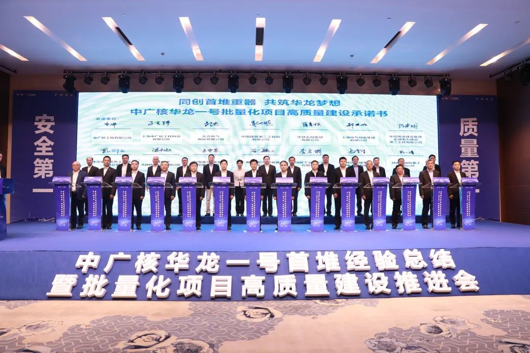 截至目前,中廣核旗下共有6臺在建核電機組,全部采用“華龍一號”技術路線,“華龍一號”批量化建設穩步推進。會上,中廣核及各參會企業共同簽署《華龍一號批量化高質量建設承諾書》,共同承諾發揮國有企業經濟增長的頂梁柱作用、科技創新的國家隊作用、安全發展的“壓艙石”作用,繼續攜手并進,共同邁向“華龍一號”項目建設新階段。
