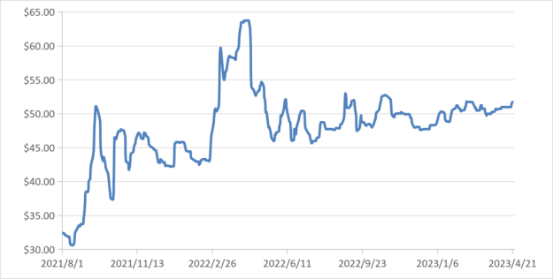 4月18—20日,世界各地的核燃料行業人士赴荷蘭參加世界核燃料循環國際會議(World Nuclear Fuel Cycle),天然鈾現貨市場流動性低,現貨鈾價連續10天維持在51美元/磅沒有變化。直至上周四,會議將近尾聲,國際貿易商重新投入天然鈾市場,現貨交易活動明顯活躍,帶動現貨鈾價上升至51.75美元/磅收盤。