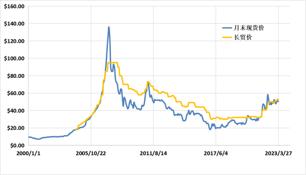 2000年1月—2023年3月末現貨鈾價和長貿鈾價