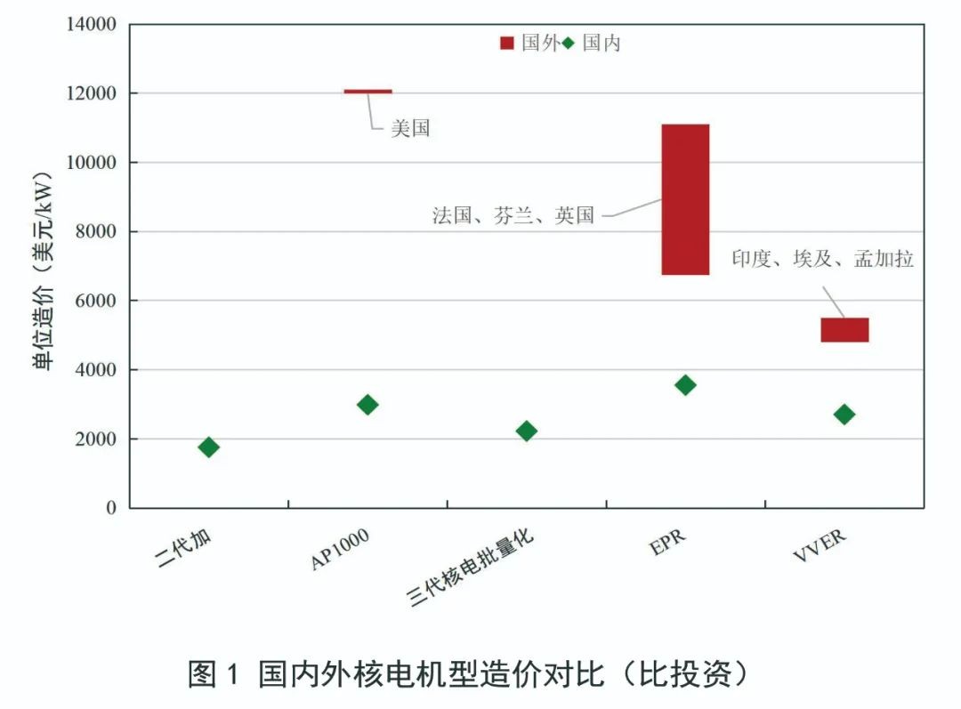 從圖1可看出,國外近期在建核電造價水平普遍大幅高于國內,不同機型間存在不小差異。以中美AP1000為例,美國AP1000首堆造價水平為國內AP1000首堆的4倍,預計批量化造價水平也將是國內的2.5~3倍。