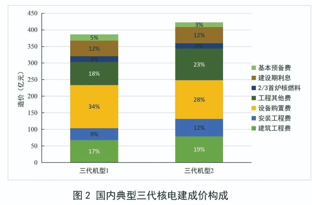 當前,國內三代核電雙機組工程建成價平均在400億元人民幣左右,典型的造價構成如圖2所示。