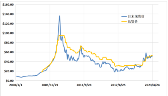 2000年1月—2023年4月末現貨鈾價和長貿鈾價