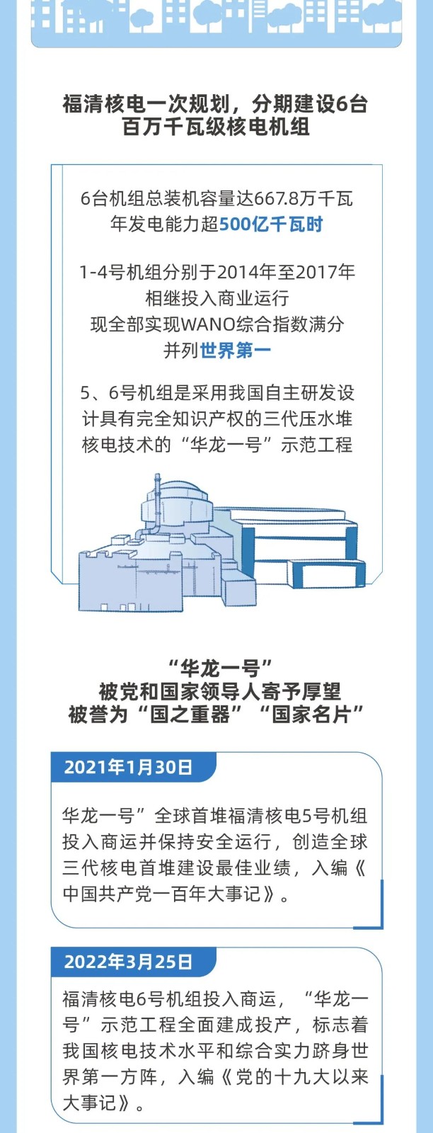2015年華龍一號(hào)全球首堆示范工程落戶福清開工建設(shè),入選《中華人民共和國(guó)大事記》。2021年華龍一號(hào)全球首堆投入商運(yùn),入編《中國(guó)共產(chǎn)黨一百年大事記》。2022年華龍一號(hào)全球首堆示范工程全面建成,入編《黨的十九大以來(lái)大事記》,亮相“奮進(jìn)新時(shí)代”主題展,連續(xù)兩年榮獲央企“十大國(guó)之重器”稱號(hào)。2023年4月27日,福清核電榮獲全國(guó)五一勞動(dòng)獎(jiǎng)狀。