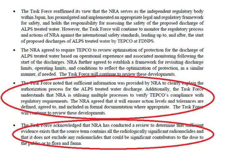 NRA已通過一次審查確定,有足夠的證據表明,處理水的監測源項包含所有具有輻射影響的放射性核素,并且在其評估中未排除任何可能對公眾或動植物構成重大輻射劑量的放射性核素。