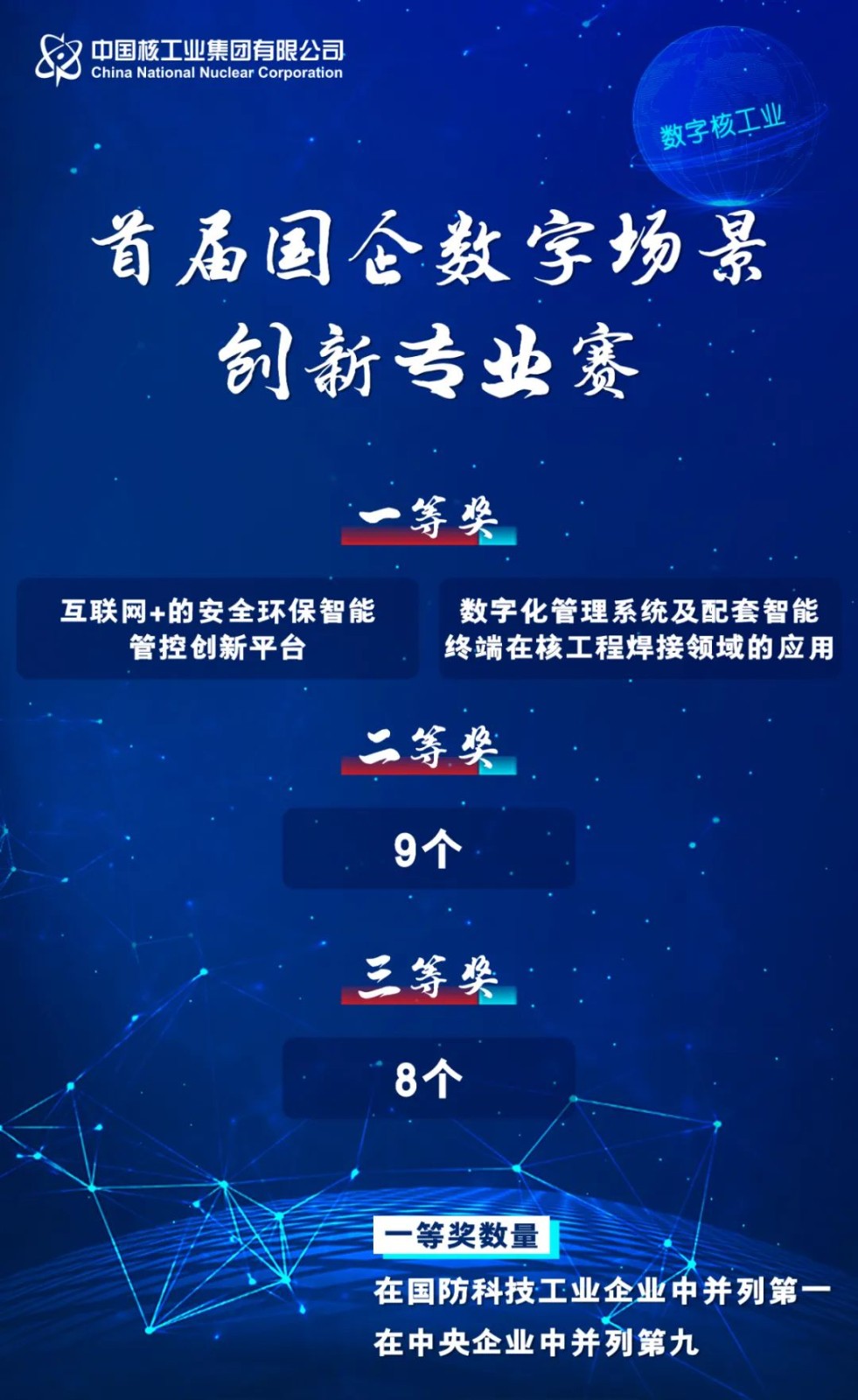 近期,國務院國資委發(fā)布首屆國企數(shù)字場景創(chuàng)新專業(yè)賽結果,中核集團“互聯(lián)網(wǎng)+的安全環(huán)保智能管控創(chuàng)新平臺”“數(shù)字化管理系統(tǒng)及配套智能終端在核工程焊接領域的應用”2個場景榮獲一等獎,9個場景榮獲二等獎,8個場景榮獲三等獎。一等獎數(shù)量在國防科技工業(yè)企業(yè)中并列首位,在央企中并列第9。繼4月21日集團公司在國資監(jiān)管數(shù)智化提升專項行動驗收評估中獲評優(yōu)秀再獲嘉獎。