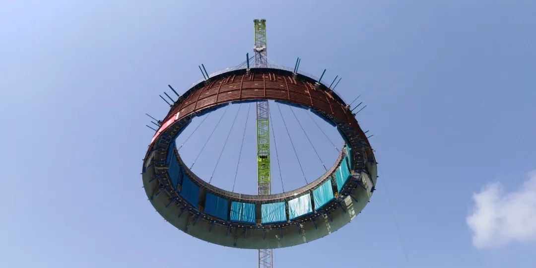 田灣核電7、8號機組核反應堆廠房為雙殼結構,其中穹頂吊裝分為球帶和球冠兩個部分。此次吊裝的球帶為環帶型結構,上口直徑36.522米,下口直徑44米,高度12.269米,球帶內分布著不同規格的安裝設備,包括16臺穹頂非能動熱交換器、44件貫穿件、4臺氫氣復合器等設備。