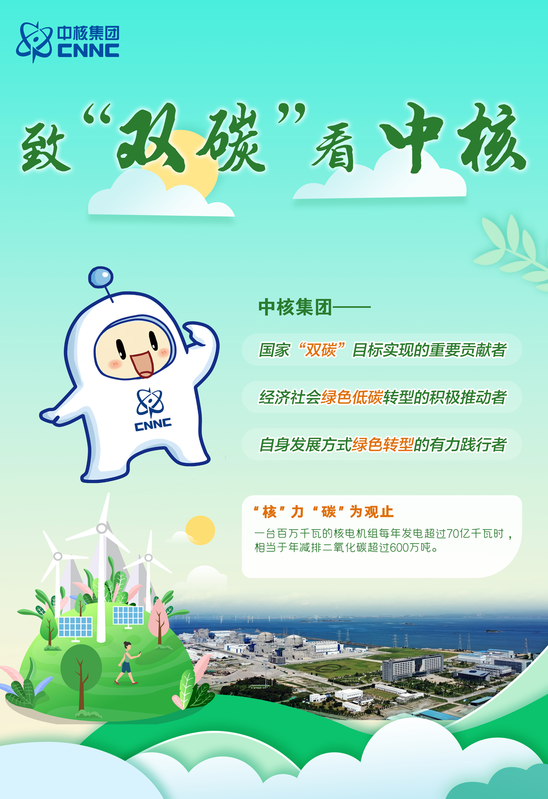 集團公司要加大在“雙碳”領域的貢獻力度,充分發揮主力軍作用,積極主動發展清潔能源;要爭當經濟社會綠色低碳轉型的推動者,加快核能在工業、建筑等行業的應用;要抓緊推動集團公司自身發展方式的綠色轉型,持續實施節能減排、提質增效行動。
