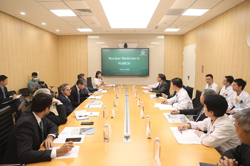 韓丁副院長(zhǎng)對(duì)格羅西先生及代表團(tuán)成員、CAEA和中核集團(tuán)領(lǐng)導(dǎo)和嘉賓到訪表示熱烈歡迎,并介紹了北京協(xié)和醫(yī)院作為中國最佳醫(yī)院排行榜中的領(lǐng)頭羊,是國家衛(wèi)生健康委指定的全國疑難重癥診治指導(dǎo)中心,始終以持續(xù)提高疾病診斷水平、治療效果和改善患者生活質(zhì)量為醫(yī)院工作核心和追求的目標(biāo)。核醫(yī)學(xué)科在霍力主任的帶領(lǐng)下,一直致力于通過創(chuàng)新技術(shù)和卓越的醫(yī)療服務(wù)為患者提供最高質(zhì)量的診療,引領(lǐng)我國核醫(yī)學(xué)領(lǐng)域的進(jìn)步和發(fā)展。韓丁副院長(zhǎng)強(qiáng)調(diào),北京協(xié)和醫(yī)院非常期待能與格羅希先生領(lǐng)導(dǎo)的國際原子能機(jī)構(gòu)以及國家原子能機(jī)構(gòu)和中核集團(tuán)開展更加廣泛和更深層次的合作與交流,進(jìn)一步推動(dòng)核醫(yī)學(xué)領(lǐng)域的技術(shù)創(chuàng)新、進(jìn)步、轉(zhuǎn)化和臨床應(yīng)用。讓更廣大的患者受益,為人類健康事業(yè)做出更大貢獻(xiàn)。