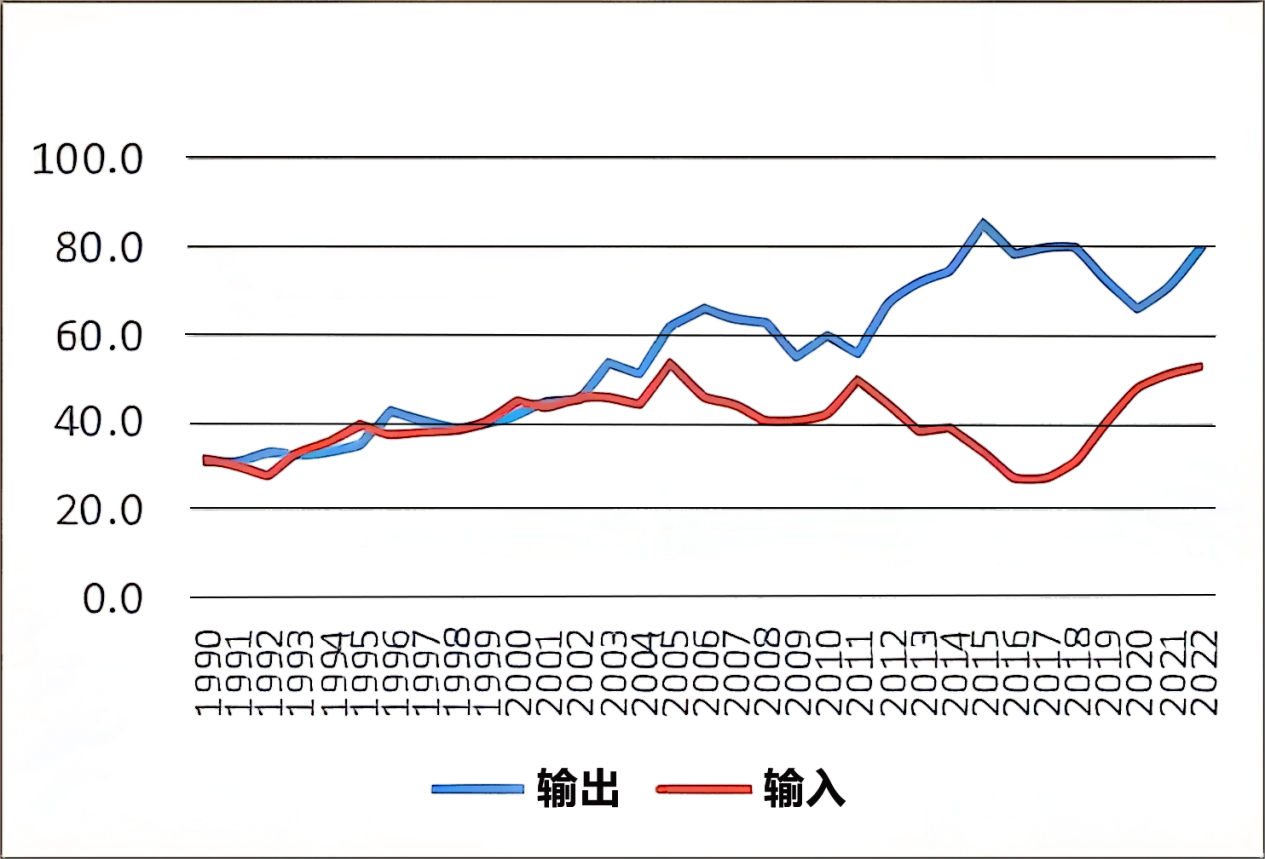首先,如圖3所示,從1990年至2022年跨國電力交易量來看,盡管每年都會有所不同,但總體上德國電力輸出超過輸入,德國確實是個電力凈出口國。2000年3月,德國《可再生能源法》出臺之后,風電和光伏發電裝機快速增長,可再生能源價格成本快速下降是電力出口增加的主要原因,由于國內可再生能源電力供給剩余,電力輸出大于輸入,輸出與輸入之間的幅度逐年拉大。但從2018年開始幅度又逐漸收窄,主要原因是可再生能源發電增速放緩,煤電利用小時數減少。眾所周知,可再生能源發電易受氣象條件制約,國與國之間通過跨國輸電網融通,則可以靈活應對供需平衡變化。德國通過一系列火電靈活性改造,與周邊國家互聯網架等已經達到了很高的可再生能源滲透率。當國內無法消納時將剩余電力出口到周邊國家,當發電量不足時再從鄰國進口電力。從年度電力進出口交易量來看,德國從國外進口約占5%左右,出口到國外約占10%左右。確切地說,德國是可再生能源電力輸出的凈出口國。但這并不意味著德國就不需要依賴法國的核電和波蘭的煤電,棄核后德國對于進口電力的依賴程度可能會有所提高。