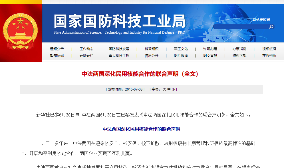 早在2015年06月30日,中法兩國(guó)就在巴黎簽署了《深化民用核能合作的聯(lián)合聲明》,感興趣的可以通過(guò)閱讀原文查閱。