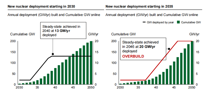 美國需要盡快為啟動先進核能大規模部署做好各項準備工作:如果在2030年啟動,并到2040年達到年均建成1300萬千瓦的速度,就能穩步實現到2050年建成2億千瓦核電裝機容量的目標;如果推遲至2035年才啟動,則可能不能實現2050年目標,或需要到2046年達到年均建成2000萬千瓦的速度,這會導致投資額增加50%(下圖)。