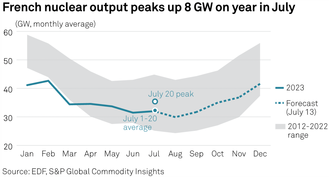 標普全球商品洞察(S&P Global Commodity Insights)的分析師預測,法國核能在今年7月和8月的平均出力為30吉瓦,全年的發電量可達309太瓦時。根據法國電網運營商RTE的數據,7月的平均出力約為32吉瓦。