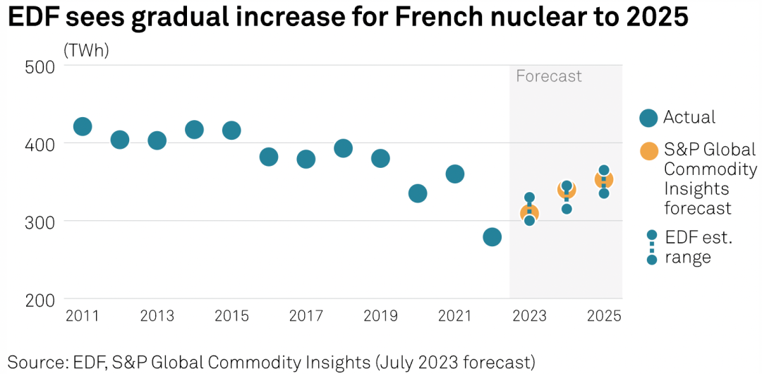 2022年法國核電產量驟降至279太瓦時,為20世紀80年代以來的最低水平。法國電力公司日前發布2023年法國核產量的預測,預計未來兩年將逐步增加,今年的核能發電量在300太瓦時至330太瓦時之間。今年夏天法國核電機組的可用性大幅提高,7月24日的出力同比增加了10吉瓦以上。
